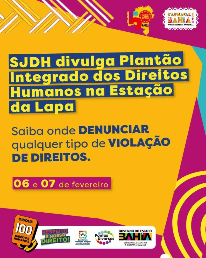 A ampla rede de proteção para garantir Direitos Humanos nos Eventos Populares da Bahia já está mobilizada para atuar no Carnaval de Salvador. Nesta terça e quarta-feira (6 e 7), equipes da Secretaria de Justiça e Direitos Humanos (SJDH) vão divulgar o projeto na Estação da Lapa, informando as pessoas sobre os serviços oferecidos no Plantão Integrado. A ação será desenvolvida em parceria com a Nova Lapa, administradora do terminal.