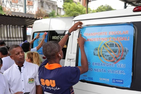 Com o intuito de coibir o transporte escolar clandestino em Salvador e reforçar a segurança das crianças, a Secretaria de Mobilidade (Semob) lançou a campanha “Não Embarque Seu Filho Nesta Viagem”, na manhã desta sexta-feira (26). A ação consiste na plotagem de adesivos perfurados nos veículos de transporte escolar para orientar os pais sobre a importância de contratar esse serviço regulamentado e os riscos de entregar as crianças para um transportador clandestino ou não credenciado pela Prefeitura.