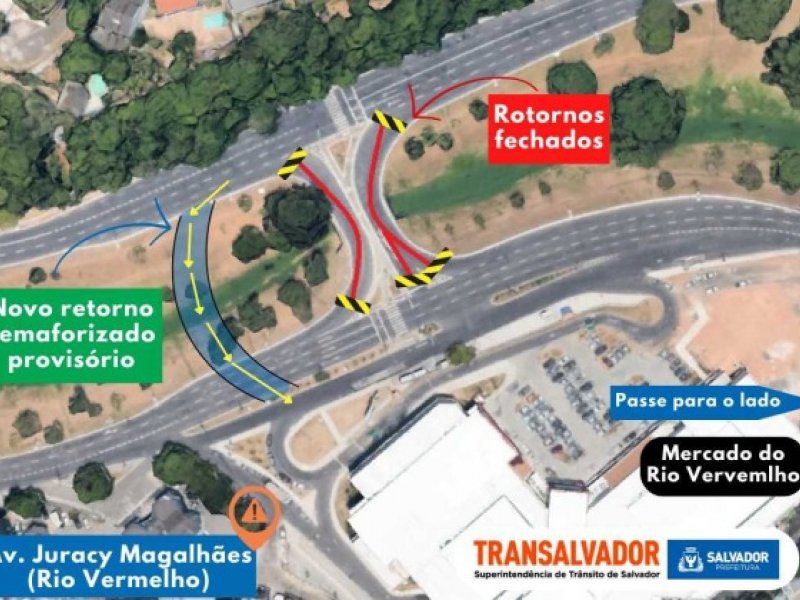 Para continuidade das obras do BRT que acontecem na Avenida Juracy Magalhães Júnior, o retorno que fica em frente à Ceasa do Rio Vermelho precisará ser fechado a partir da noite desta quinta-feira (14). A solicitação de bloqueio foi feita pela Superintendência de Obras Públicas do Salvador (Sucop), responsável pela obra.